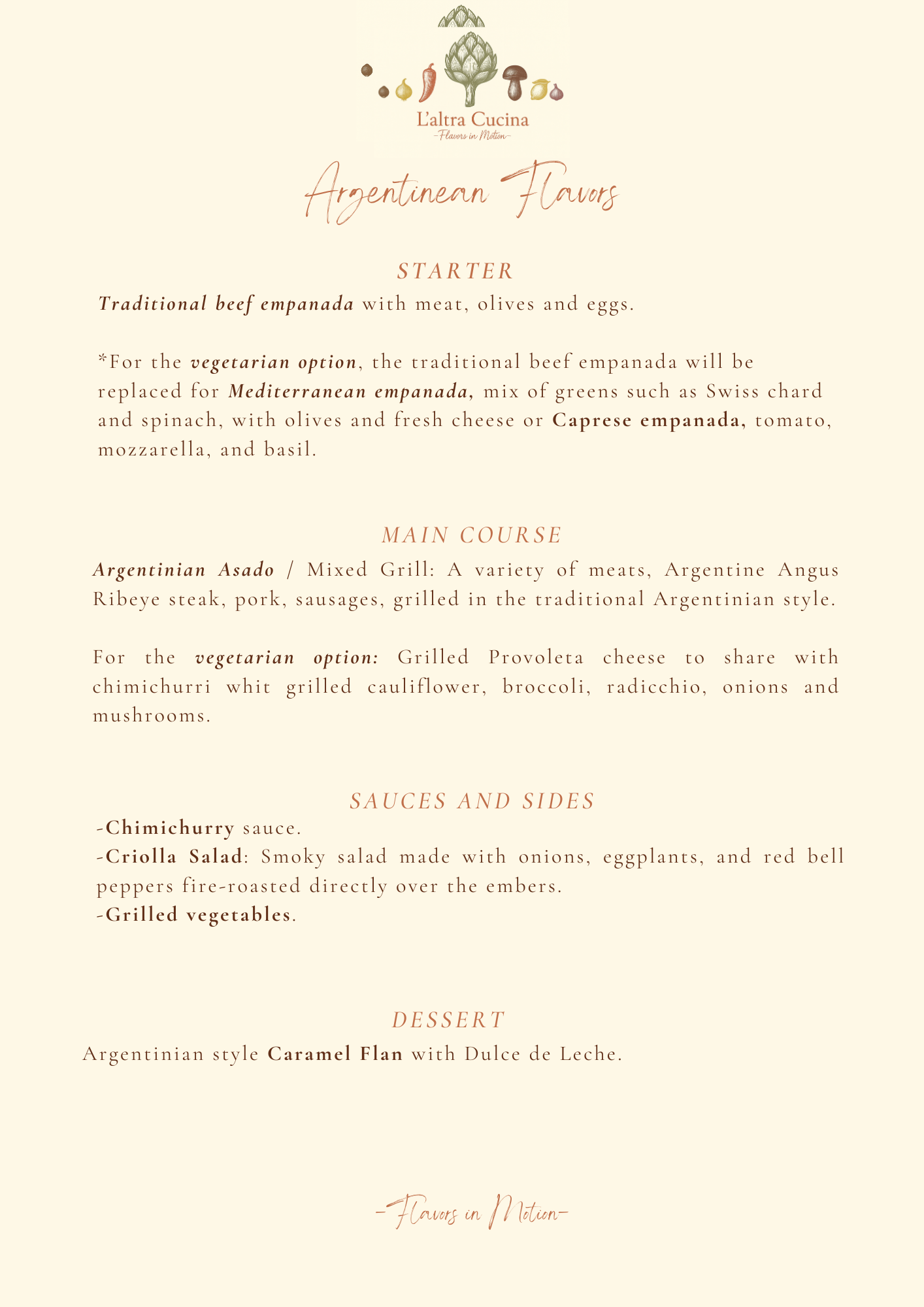 Below you’ll find a selection of sample MENU from our LATINOAMERICA inspired cuisine. These are meant to serve as a starting point and source of inspiration.